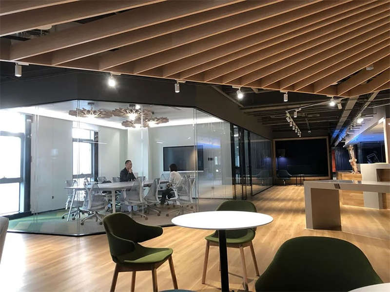 材料運用上,采用一系列天然、可再生和低排放的節(jié)能措施和材料,讓員工感受到與自然的聯(lián)系,同時提供了室內聲學舒適度。還采用了公司貿易產品——玻璃,各種玻璃的運用,充分體現(xiàn)了企業(yè)性質及對玻璃加工工藝的理解,既作為裝飾材料,也讓辦公區(qū)各個區(qū)域都成了產品展示區(qū),電梯廳和門廳運用了黑色背烤漆蒙砂玻璃,電梯廳頂部運用黑色銀鏡腐蝕雕刻形成總部辦公地所在的區(qū)域地圖,其他區(qū)域也充分將壓花玻璃、幕墻玻璃、淋浴隔斷玻璃及辦公高隔玻璃等進行了充分展示。