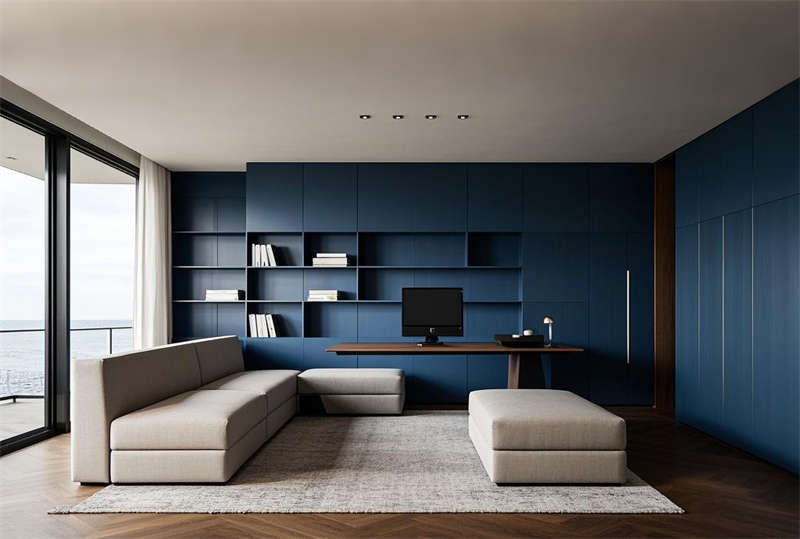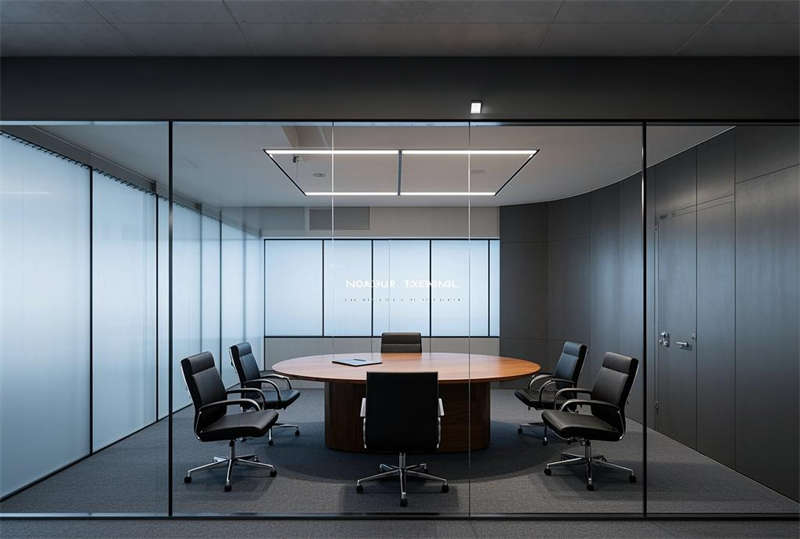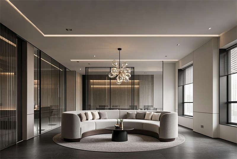 本方案采用現(xiàn)代簡約設(shè)計(jì)語言,整體空間以淺灰、白、原木三色為主基調(diào)。前臺區(qū)設(shè)置懸浮式接待臺與發(fā)光LOGO墻,搭配LED線性照明塑造企業(yè)形象。開放式辦公區(qū)采用模塊化工位布局,通過玻璃隔斷劃分功能區(qū)域,保證自然采光最大化的同時提升空間通透感。智能會議系統(tǒng)集成于各會議室,配備電動投影和書寫玻璃墻。經(jīng)理室采用深藍(lán)色烤漆木飾面提升商務(wù)質(zhì)感,休息區(qū)設(shè)置咖啡吧與卡座強(qiáng)化員工關(guān)懷。走廊運(yùn)用導(dǎo)視燈帶串聯(lián)各區(qū)域,茶水間六角地磚增添趣味性。培訓(xùn)室階梯式布局配合吸音墻面確保聲學(xué)效果,電話間磨砂玻璃立方體兼顧隱私與采光。VIP室智能霧化玻璃實(shí)現(xiàn)空間靈活轉(zhuǎn)換,整體設(shè)計(jì)注重功能分區(qū)與人文關(guān)懷的平衡。