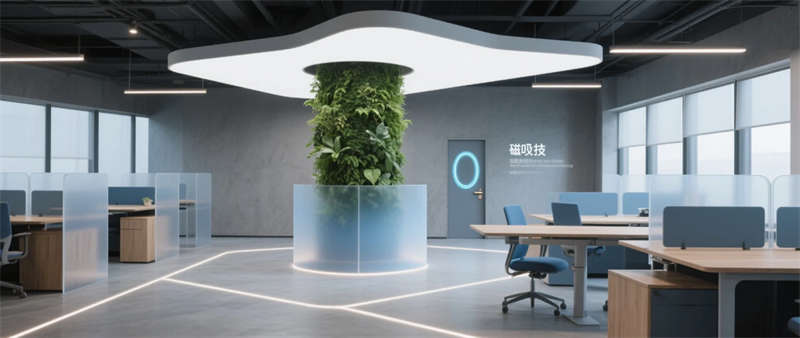 本項(xiàng)目以“未來(lái)生態(tài)辦公”為核心理念,打造1200㎡科技與自然交融的創(chuàng)新型辦公空間。設(shè)計(jì)采用啞光太空灰為主基調(diào),通過霧霾藍(lán)企業(yè)色與原木紋理的碰撞,在冷峻科技感中注入人文溫度??臻g以微水泥地面為基底,貫穿透光亞克力與陽(yáng)極氧化鋁材質(zhì),配合隱藏式線性燈帶的流動(dòng)光影,構(gòu)建出具有呼吸感的數(shù)字美學(xué)場(chǎng)域。