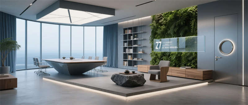 入口大廳以8米寬LED弧形屏呈現(xiàn)動(dòng)態(tài)視覺沖擊,懸浮曲面黑巖板前臺(tái)與天花垂墜的3D打印樹脂裝置形成虛實(shí)對(duì)話;開放式辦公區(qū)通過模塊化磁吸工位與中央綠植柱,實(shí)現(xiàn)靈活協(xié)作與生態(tài)療愈的平衡;總裁辦公室270°全景落地窗搭配懸浮會(huì)議島,幾何切割天花與火山石茶臺(tái)演繹力量與自然的共生哲學(xué)。