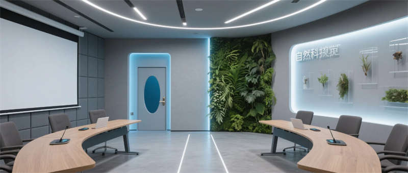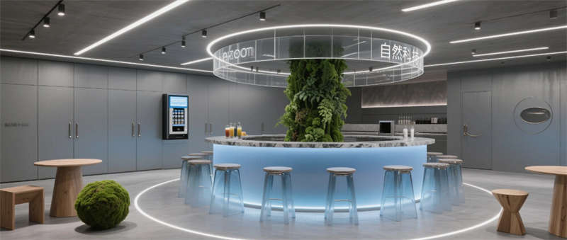各區(qū)域通過四大統(tǒng)一性語(yǔ)言緊密串聯(lián):霧霾藍(lán)橢圓金屬門把手貫穿全空間,再生材料家具呼應(yīng)可持續(xù)發(fā)展理念,聲學(xué)墻面嵌入本地植物標(biāo)本強(qiáng)化生態(tài)屬性,智能燈光系統(tǒng)則通過4000K色溫線性燈帶實(shí)現(xiàn)晝夜場(chǎng)景的無(wú)縫切換。特別設(shè)計(jì)的全息投影展廳與智能階梯會(huì)議室,通過LED交互地屏與AR懸浮展臺(tái),將品牌科技基因融入空間體驗(yàn)。