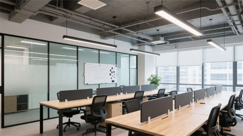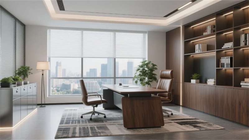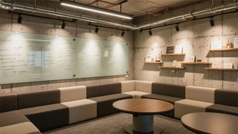 從前臺(tái)懸浮木紋臺(tái)面的企業(yè)標(biāo)識(shí),到開放式工位可變的模塊化組合,空間始終保持著“未完成”的進(jìn)化基因。頭腦風(fēng)暴區(qū)的可書寫玻璃墻記錄著思維軌跡,階梯培訓(xùn)區(qū)的滑軌電源系統(tǒng)隨需求生長(zhǎng),智能會(huì)議室霧化玻璃在透明與私密間自由切換,專注電話艙的磨砂質(zhì)感包裹著獨(dú)立思考的靜謐。高管辦公室的皮質(zhì)座椅與垂直線條燈帶,隱喻著決策的柔韌與果決,而咖啡區(qū)黑板墻的手繪痕跡,則讓機(jī)械齒輪般的空間有了呼吸的節(jié)奏。