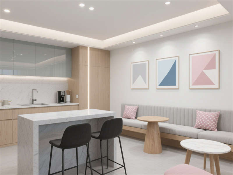 外觀設(shè)計(jì)上,采用淺灰色墻面搭配超白玻璃幕墻,玻璃內(nèi)側(cè)的品牌標(biāo)識(shí)與門(mén)前綠植相呼應(yīng),弱化了建筑的冷硬感,展現(xiàn)出簡(jiǎn)約大氣的辦公形象。進(jìn)入室內(nèi),前臺(tái)接待區(qū)以淺灰與米白為基礎(chǔ)色調(diào),L型前臺(tái)搭配柔和燈光,等候區(qū)的布藝沙發(fā)與原木元素結(jié)合,給訪客帶來(lái)溫和專業(yè)的第一印象。?