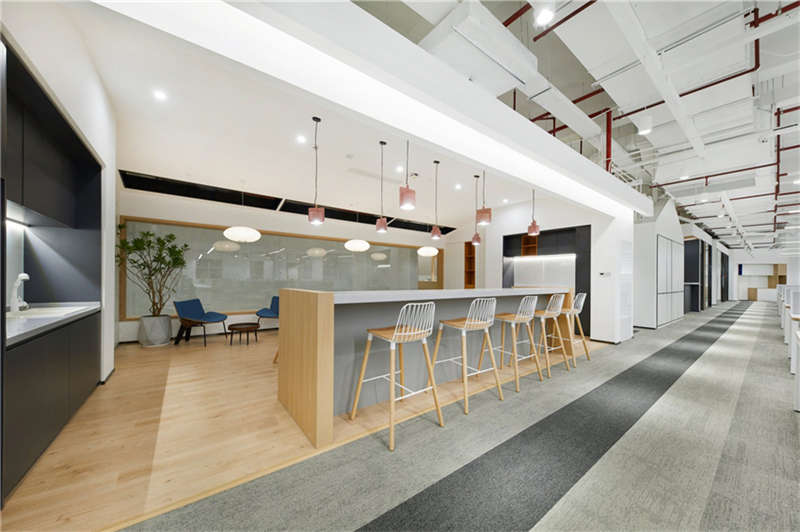 工位數(shù)量需求雖然龐大,但甲方對(duì)多元化的功能區(qū)的需求并未減少。于是我們將咖啡吧、茶水間、休閑區(qū)這幾個(gè)功能進(jìn)行融合,破除了空間的界定,將水吧區(qū)打造成一個(gè)開(kāi)放性的多功能區(qū)域,賦予它全新定義,從而達(dá)到滿(mǎn)足員工的一系列休閑目的。