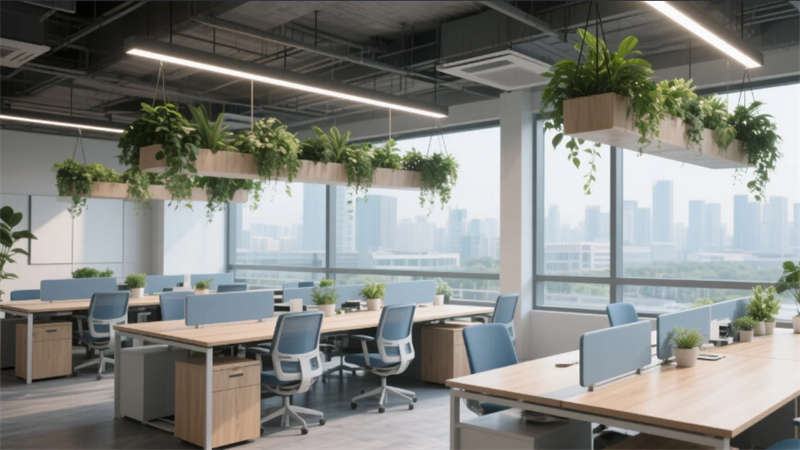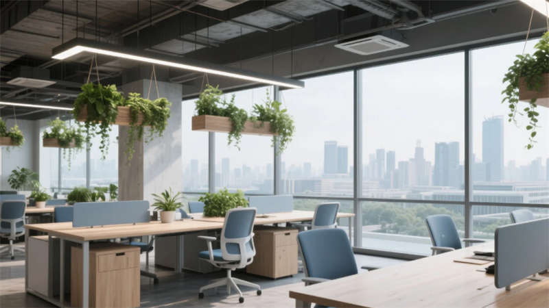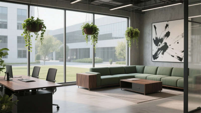 該辦公空間以"自然共生"為核心理念,將科技感與人文溫度融入兩千平米的開放場(chǎng)域。流動(dòng)的淺木色調(diào)貫穿始終,啞光金屬與微水泥形成質(zhì)感對(duì)話,模塊化家具構(gòu)建靈活場(chǎng)景。綠植生態(tài)系統(tǒng)從空中吊籃蔓延至苔蘚墻面,模糊室內(nèi)外界限。