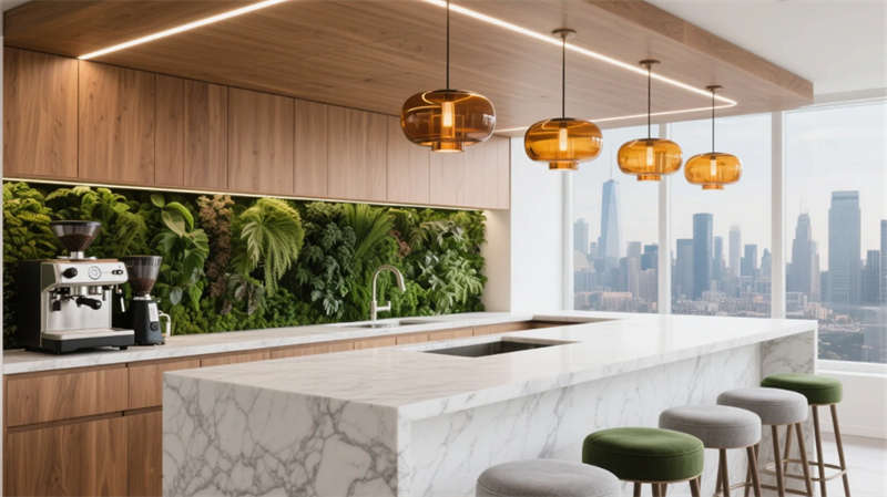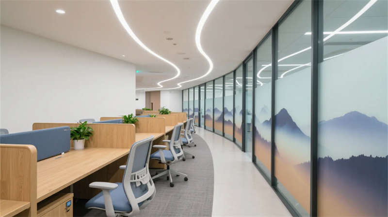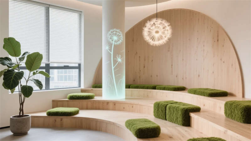 階梯式沙龍區(qū)打破傳統(tǒng)會議格局,弧形看臺激發(fā)平等交流,全息投影讓思維可視生長。茶水間垂直花園與咖啡香氣交織,成為非正式碰撞火花的土壤。獨立辦公區(qū)低隔斷設(shè)計延續(xù)視野通透,曲線燈帶如枝蔓延伸,提示著人與空間的有機聯(lián)結(jié)。