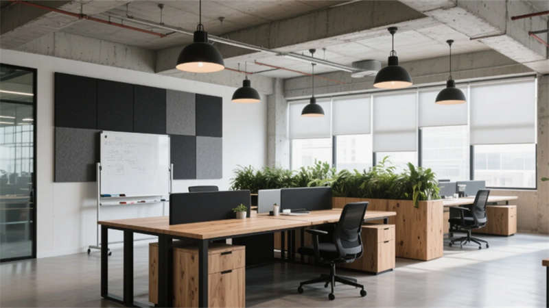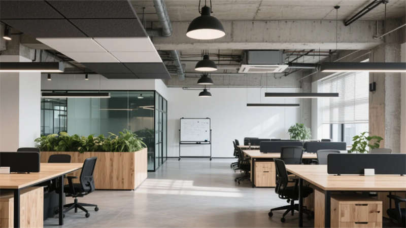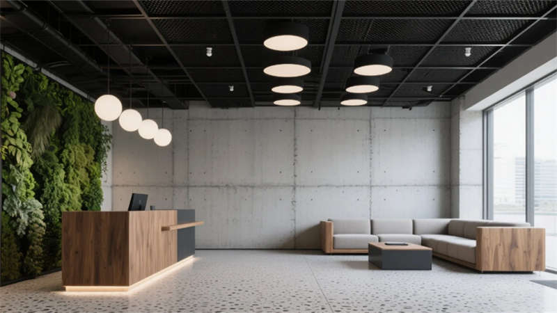步入大堂,粗獷的混凝土墻面與水磨石地面形成質感對話,懸浮金屬網天花下,原木前臺與背光綠植墻暈染出溫潤生命力。開放式辦公區(qū)延續(xù)工業(yè)基調,模塊化橡木桌搭配黑色鋼架,綠植隔斷巧妙劃分空間,自然光穿過智能遮陽簾,在混凝土天花上投下流動的光影詩行。