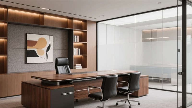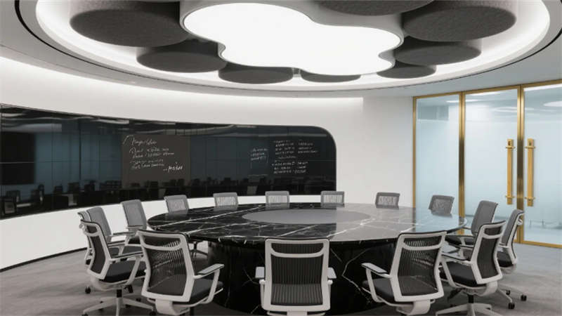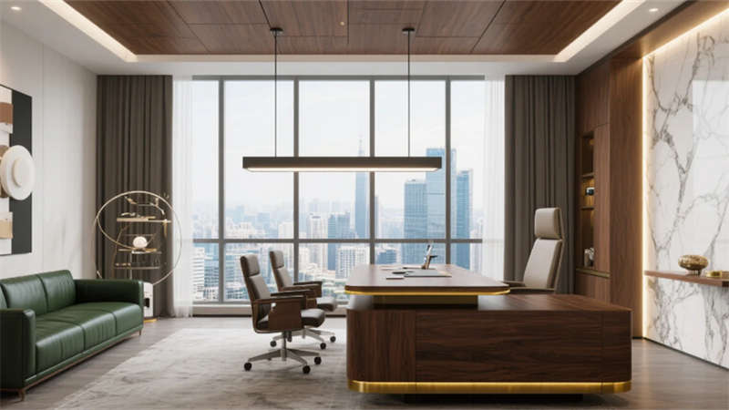 私密空間演繹克制的精致:經理辦公室玻璃隔斷內,胡桃木書桌與毛氈吸音墻平衡理性與溫度;總裁套間則以大理石暗光墻面對話城市天際線,黃銅細節(jié)點亮低調的尊崇。會議室黑石長桌與磁吸玻璃書寫面碰撞靈感,而公共休息區(qū)陶土花盆與橄欖綠軟墊,在混凝土中島上生長出松弛的煙火氣。