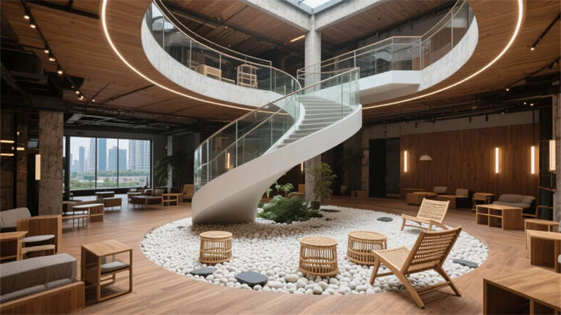 開放式核心區(qū)采用模塊化家具系統(tǒng),配合智能照明與聲學優(yōu)化,兼顧協(xié)作效率與專注需求;階梯沙龍與透明會議盒子激發(fā)即興創(chuàng)新,可移動隔斷實現(xiàn)場景自由切換。最具特色的是貫穿三層的垂直生態(tài)中庭,旋轉樓梯纏繞常綠藤蔓,成為連接空間的活力紐帶。