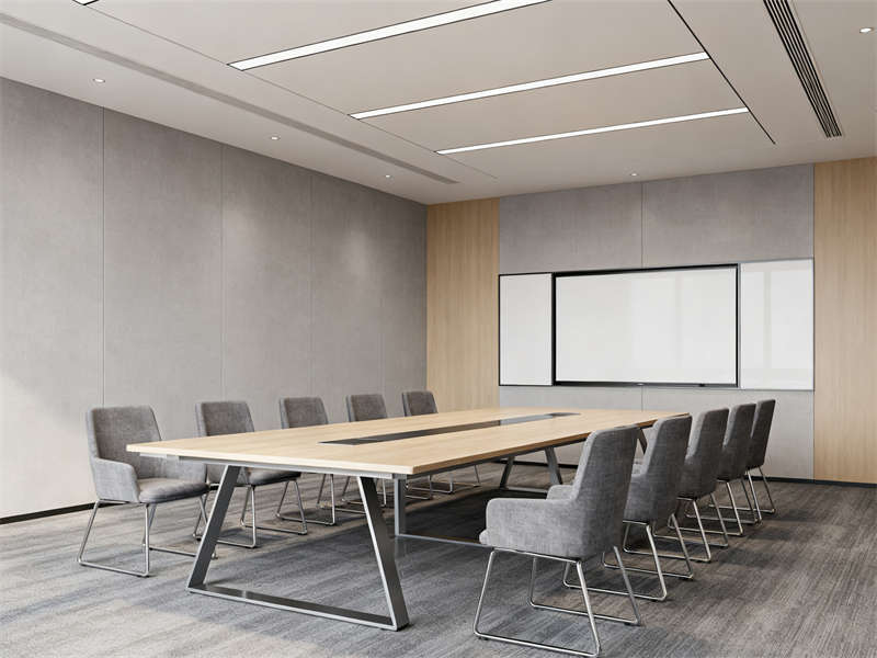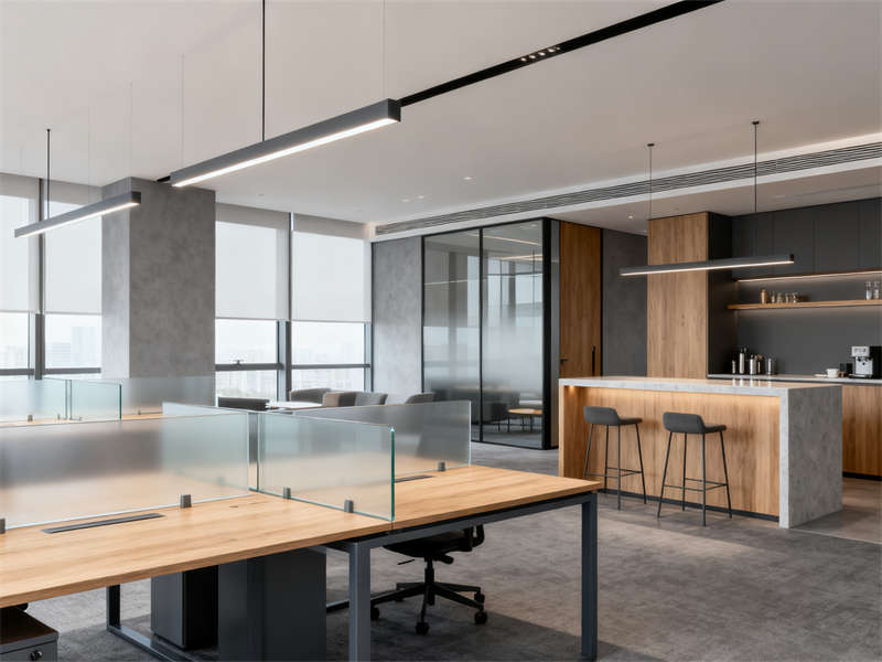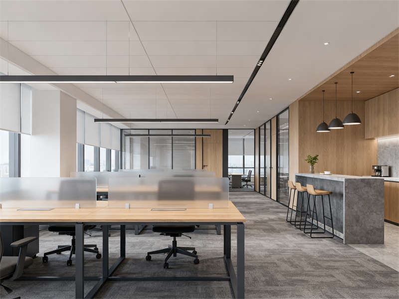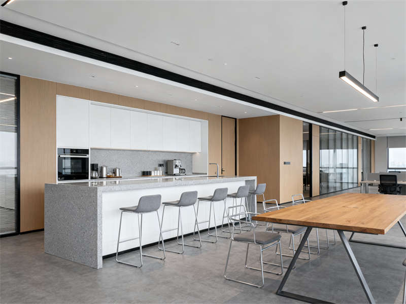 中型會議室圍繞協(xié)作功能展開,長條式會議桌與玻璃隔斷搭配,既保證空間開闊,又能與外部辦公區(qū)形成視覺聯(lián)動,灰色布藝座椅與頂部圓形吊燈呼應,讓會議場景兼具功能性與舒適感。茶水間則通過淺灰石英石臺面、木色護墻板與暖光燈帶,營造輕松休閑的氛圍,成為辦公間隙的放松節(jié)點。