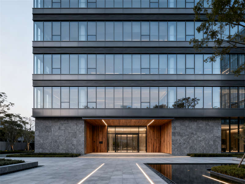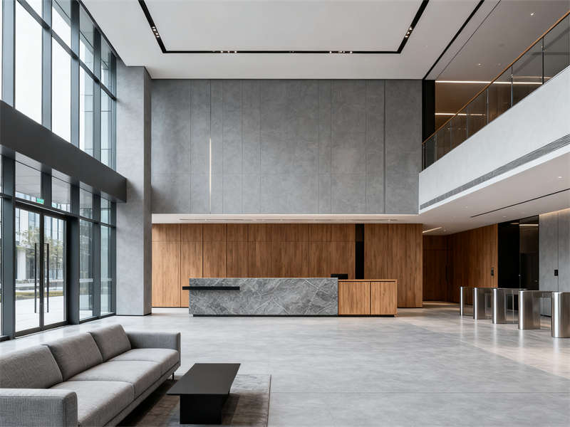 入口大堂以開闊格局為核心,淺灰地磚搭配低飽和木色前臺,弱化厚重感的同時,用金屬線條勾勒細節(jié),讓第一印象既專業(yè)又通透。玻璃隔斷貫穿多個區(qū)域,在走廊處搭配木色門牌,既保證采光,又通過材質(zhì)呼應強化整體感,避免空間割裂。