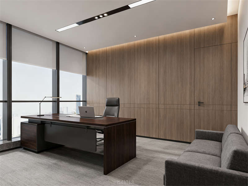 開放辦公區(qū)以通透協(xié)作為設計重點,半透明磨砂玻璃隔板兼顧隱私與互動,木色桌面與深灰金屬支架結(jié)合,延續(xù)整體材質(zhì)基調(diào),搭配簡約照明,營造專注且不壓抑的工作氛圍。獨立辦公室劃分出辦公與接待區(qū)域,木飾面背景墻搭配淺灰布藝沙發(fā),在保持商務感的同時,增添柔和質(zhì)感,滿足私密溝通需求。