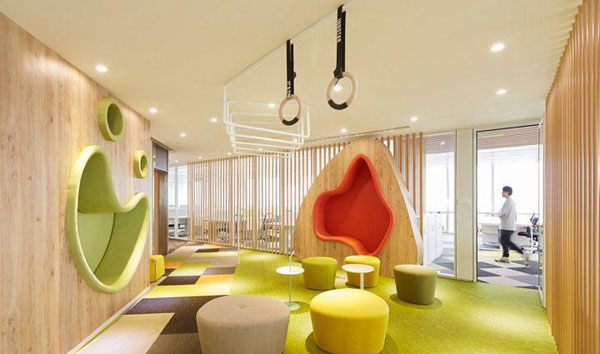 在樹(shù)屋的另一側(cè)設(shè)計(jì)著吊杠和造型樹(shù)洞,以及擺放活潑多樣的休閑家私,增添了工作或者閑暇溝通中的樂(lè)趣和互動(dòng)性更讓員工在輕松辦公的同時(shí)有拉伸小鍛煉的機(jī)會(huì)