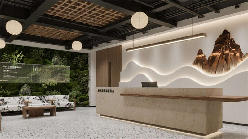 前臺大廳成為文化凝練的序章:層疊銅藝山形墻在光暈中起伏,夯土臺面與懸浮木構(gòu)的碰撞隱喻傳統(tǒng)與未來的對話。紙膜藝術(shù)燈如空中浮云,柔化工業(yè)風(fēng)的冷峻基調(diào)。