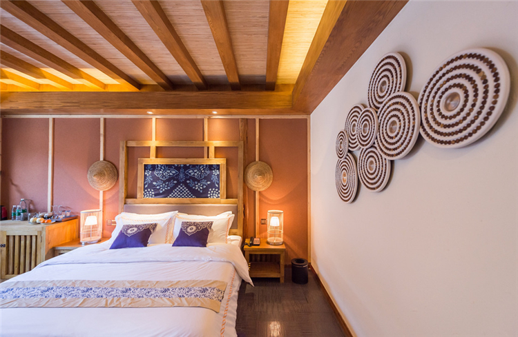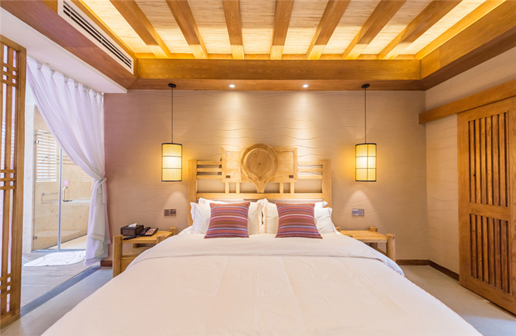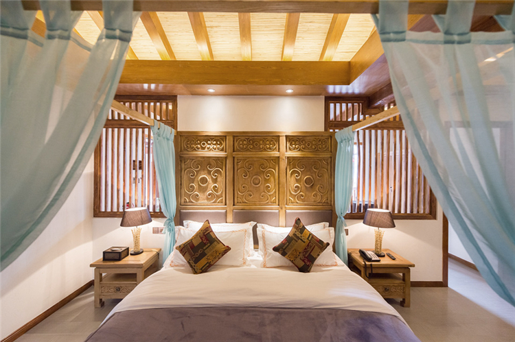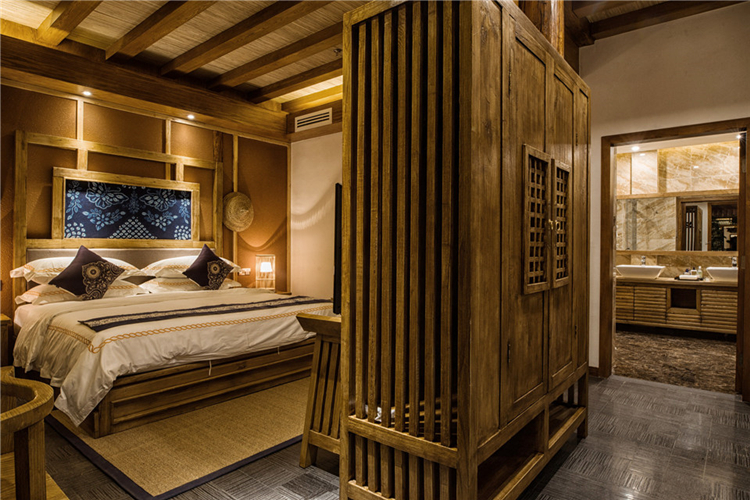設(shè)計(jì)理念:鏤空隔斷,木質(zhì)材料的建筑體和磚石融為一體;水榭亭臺(tái),回廊木椅,大量木質(zhì)材料運(yùn)用到門(mén)窗、家具、吊頂、地板、衣柜等區(qū)域,配合木質(zhì)的造型、雕花等,燈光設(shè)計(jì)與軟裝相呼應(yīng),燈光顯形,軟裝在燈光的照射下散發(fā)出軟裝配飾原有的色彩,營(yíng)造出溫馨而絢爛的印象。