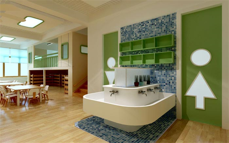 洗手區(qū)域的設(shè)計(jì):此處通往的是就餐區(qū),在洗手池的設(shè)計(jì)上,設(shè)計(jì)師對(duì)地面、洗手池都做了處理,目的就是為了避免因?yàn)樗斐傻牡孛鏉窕瑑蓚€(gè)門一個(gè)進(jìn)一個(gè)出,設(shè)計(jì)是希望可以從小培養(yǎng)孩子排隊(duì)的意識(shí),一進(jìn)一出之間也見證了教育的重要性。