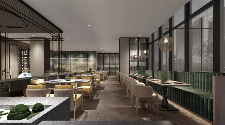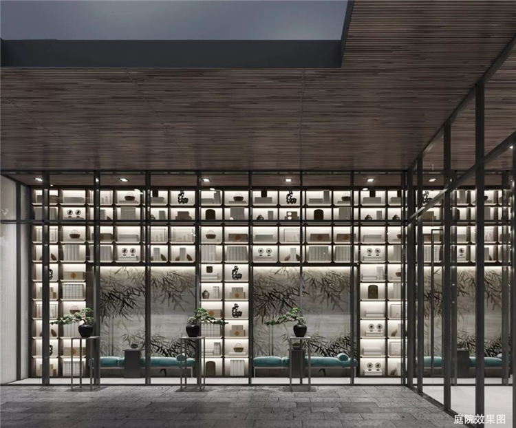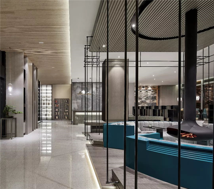 傳統(tǒng)與現(xiàn)代的融合變通,通過(guò)汲取傳統(tǒng)徽派的木構(gòu)斗拱、瓦片、留白的山墻和民居的水墨意境,運(yùn)用新的材料進(jìn)行演繹,如水磨石的地面、背景墻藝術(shù)圖案結(jié)合金屬網(wǎng)、半透的夾絲玻璃、黑色的金屬構(gòu)建.以寫(xiě)意的方式提取徽州的意境,延續(xù)徽派建筑的黑白兩色,再點(diǎn)以中國(guó)傳統(tǒng)色系軟裝搭配,表達(dá)了設(shè)計(jì)對(duì)傳統(tǒng)的回歸和未來(lái)的展望.