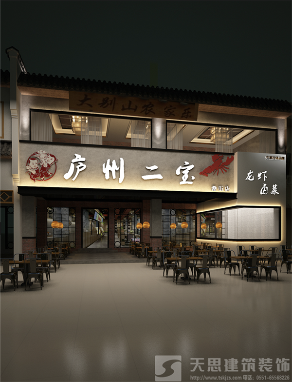 店面裝修設(shè)計:麻辣蝦幾個大字和龍蝦圖形,讓客戶清楚的看到本店的主營業(yè)務(wù),小空間大介紹,目的就是為了突出餐飲店的介紹,主次分明,是設(shè)計中的重要一環(huán)。
