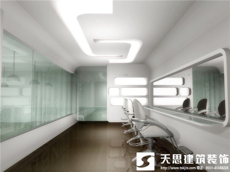美發(fā)店的操控區(qū)占整個店面面積的四分之三到三分之二不等,操作區(qū)是直接服務顧客的地方,設計師秉承以寬松、干凈、舒適為宗旨,考慮到了顧客方便、暢通。美發(fā)店整體設計要求鏡子要明亮,椅子、床鋪要精美,外形要獨特,色調要統(tǒng)一。