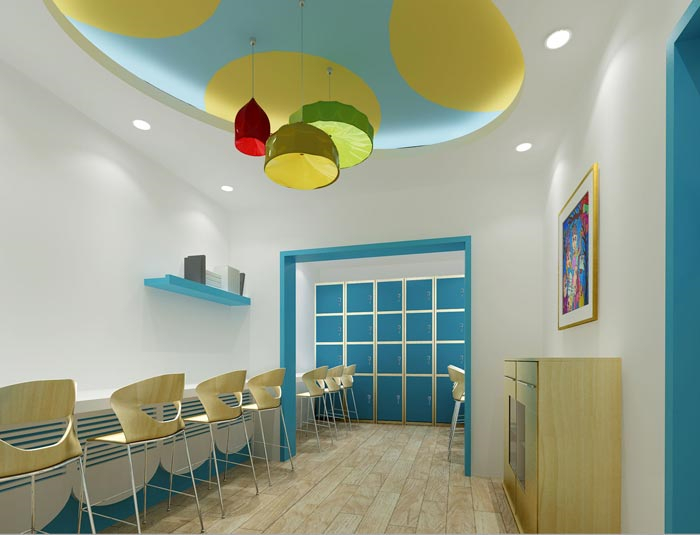 休息區(qū)域的設計:此處不僅可供教師休息,同時也可供孩子們在這里玩耍、娛樂,設計師的目的就是想讓大家在這里可以感受到陽光的溫暖,在此處陽光滲透到每一處空間,設計師希望陽光、自然可以掃清教師心中的煩躁,同時也給孩子更多的溫暖。