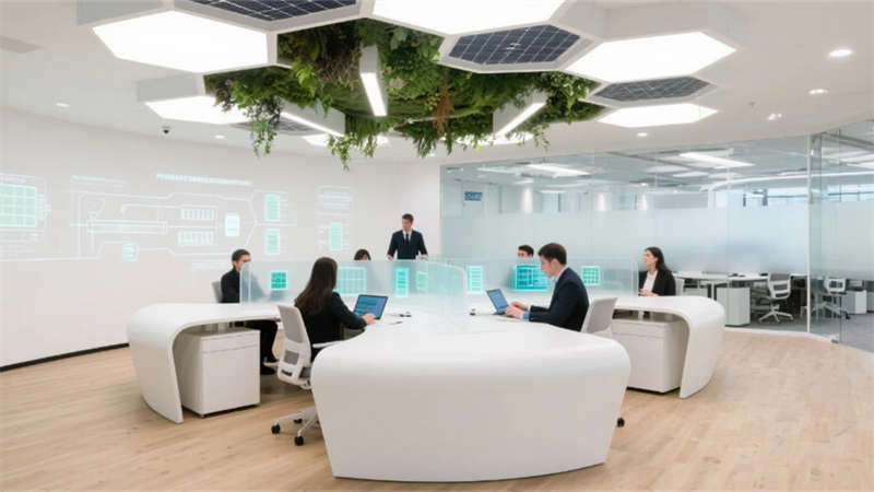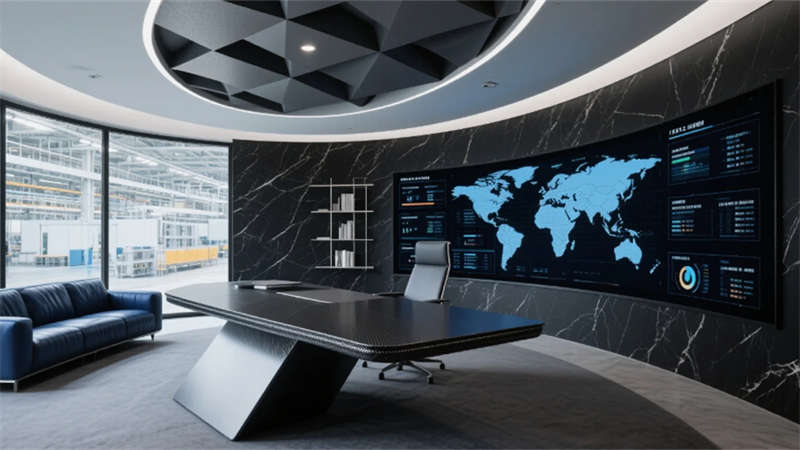 開放式辦公區(qū)打破傳統(tǒng)壁壘,蜂窩狀工位與懸浮綠植裝置詮釋靈動(dòng)協(xié)作,透明屏幕上的數(shù)據(jù)流與玻璃隔斷投影的生產(chǎn)流程圖虛實(shí)相映??偛每臻g則如懸浮的智慧中樞,弧形落地窗將車間全景化作動(dòng)態(tài)壁畫,金屬與大理石的碰撞間,流淌著決策與創(chuàng)新的電流。智能倉(cāng)儲(chǔ)區(qū)立體貨架的金屬骨骼間,無(wú)人機(jī)如蜂鳥般掠過(guò)貨品,天光與電子標(biāo)簽的光斑在環(huán)氧地面上跳動(dòng)著數(shù)字時(shí)代的韻律。