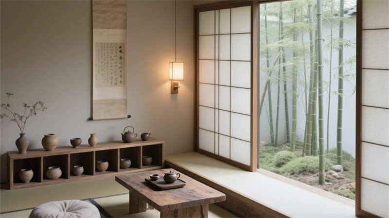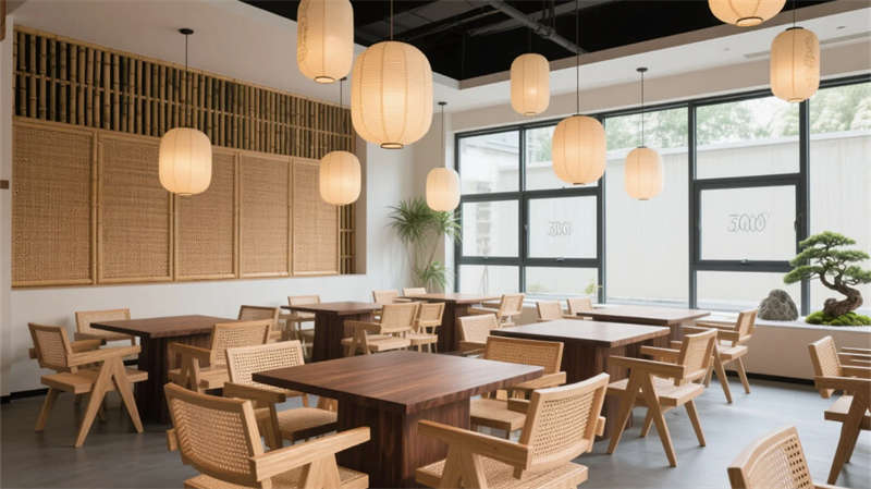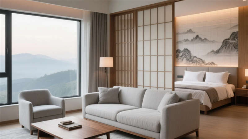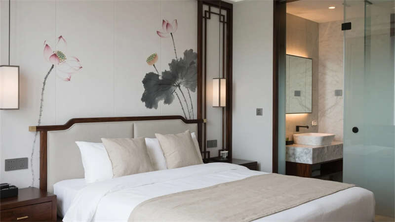 大堂以格柵天花與山水背景墻定調(diào),光影交錯(cuò)間傳遞寧靜力量。餐廳借竹編與紙燈演繹傳統(tǒng)匠心,窗外庭院景觀延伸視覺層次??头哭饤壏睆?fù)裝飾,棉麻材質(zhì)與低飽和度色彩引導(dǎo)深度放松,套房通過屏風(fēng)巧妙劃分動(dòng)靜區(qū)域。茶室以博古架和宣紙屏風(fēng)構(gòu)筑禪修意境,而庭院花園的枯山水與竹影,則成為自然與建筑的共生隱喻。