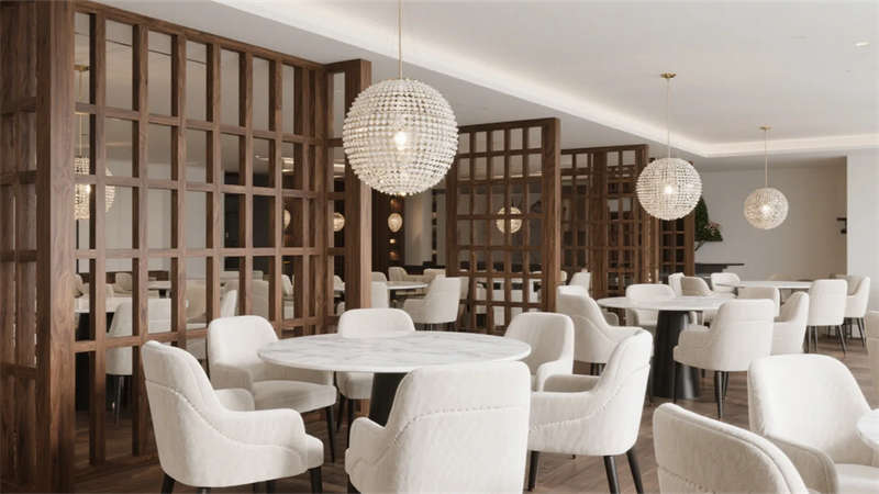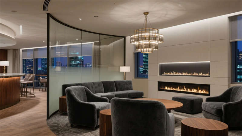 公共空間注重功能與美學(xué)的平衡。行政酒廊通過(guò)弧形玻璃劃分動(dòng)靜區(qū)域,嵌入式壁爐跳動(dòng)的火焰軟化商務(wù)空間的冷峻感;多功能會(huì)議室采用可變形家具系統(tǒng),胡桃木飾面墻與線性燈光共同構(gòu)建專注場(chǎng)域;全日餐廳以開(kāi)放式廚房為舞臺(tái),球形吊燈在巖板餐桌上投下溫暖光暈,激發(fā)商務(wù)社交的愉悅可能。