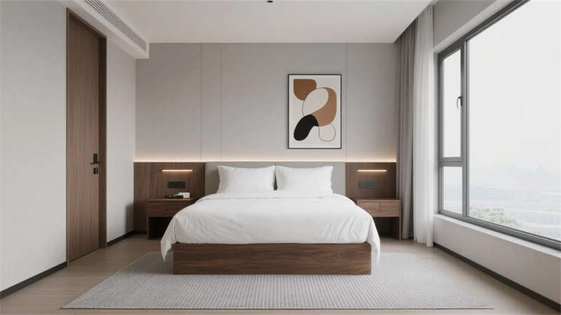 這個(gè)商務(wù)酒店的設(shè)計(jì)以現(xiàn)代簡(jiǎn)約美學(xué)重構(gòu)城市商旅空間。設(shè)計(jì)摒棄繁復(fù)裝飾,運(yùn)用暖灰與胡桃木的主色調(diào)營(yíng)造溫潤(rùn)氛圍,香檳金金屬細(xì)節(jié)勾勒精致輪廓,在理性秩序中注入藝術(shù)溫度。