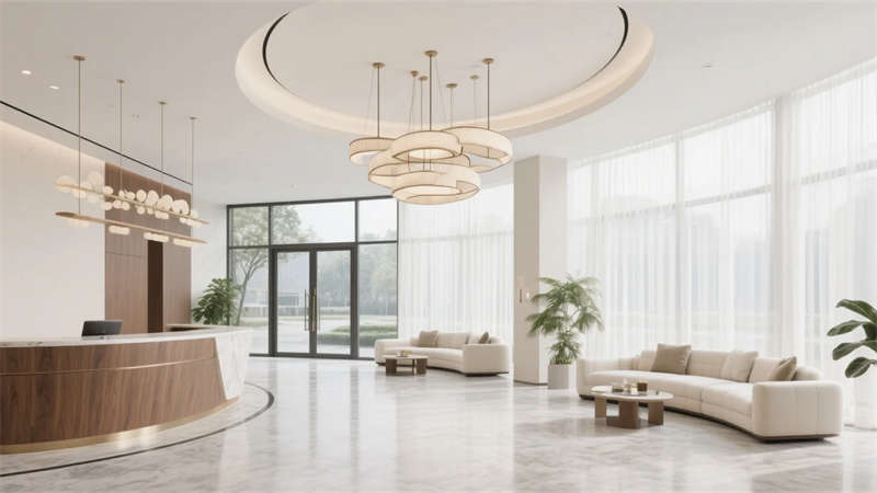 步入挑高大廳,弧形前臺(tái)與懸浮燈飾構(gòu)成視覺(jué)焦點(diǎn)。天然石材地面倒映著落地窗引入的天光,米白色沙發(fā)組錯(cuò)落分布于綠植景觀間,模糊室內(nèi)外邊界的同時(shí),為商務(wù)會(huì)晤創(chuàng)造輕松場(chǎng)域??头垦永m(xù)克制設(shè)計(jì)語(yǔ)言,懸浮式家具減輕空間負(fù)重,隱藏?zé)魩г诨宜{(lán)色床品上投下柔光,全景窗將城市天際線轉(zhuǎn)化為動(dòng)態(tài)壁畫(huà)。