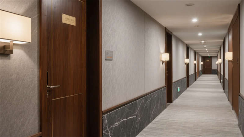 健康關(guān)懷滲透于細(xì)節(jié)設(shè)計(jì)中。健身房落地窗最大化引入自然景觀,橡膠地面與鏡面墻體形成虛實(shí)對(duì)話;電梯廳香檳金轎廂與石材墻面碰撞出質(zhì)感層次,每處轉(zhuǎn)角皆設(shè)置藝術(shù)端景,讓行進(jìn)過(guò)程成為美學(xué)巡禮。走廊絨面墻體的細(xì)膩觸感消解了通道的單調(diào)性,精心計(jì)算的燈光角度引導(dǎo)賓客自然抵達(dá)目的地。