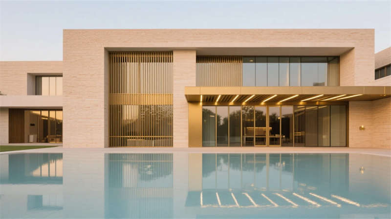 建筑外觀通過香檳金格柵與玻璃的虛實對話,成為城市界面的優(yōu)雅符號。室內外空間流暢銜接,光影在金屬、石材與水體間自然游走,最終凝聚成兼具現(xiàn)代鋒芒與人文溫度的都市謐境,為賓客提供超越尋常的精神棲居。