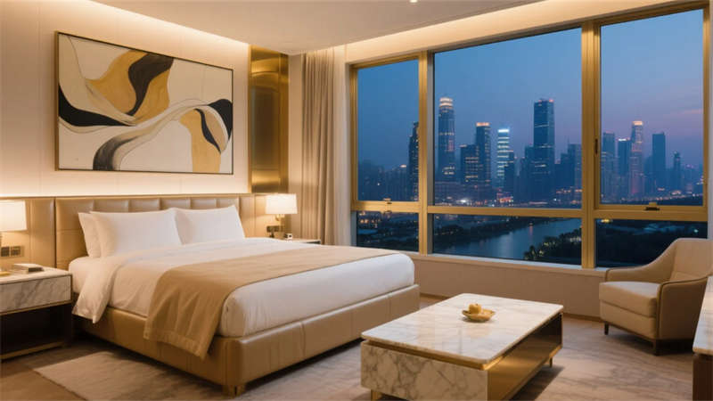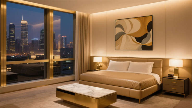 酒店以當代輕奢美學為靈魂,將精致質感融入每個空間肌理。淺金色金屬與溫潤大理石的碰撞,勾勒出低調奢華的氣質基底,暖灰中性色調營造舒緩靜謐的氛圍場域。落地玻璃幕墻引自然入室,琥珀色玻璃屏風與鎏金藝術裝置在光影交織中煥發(fā)靈動生機。