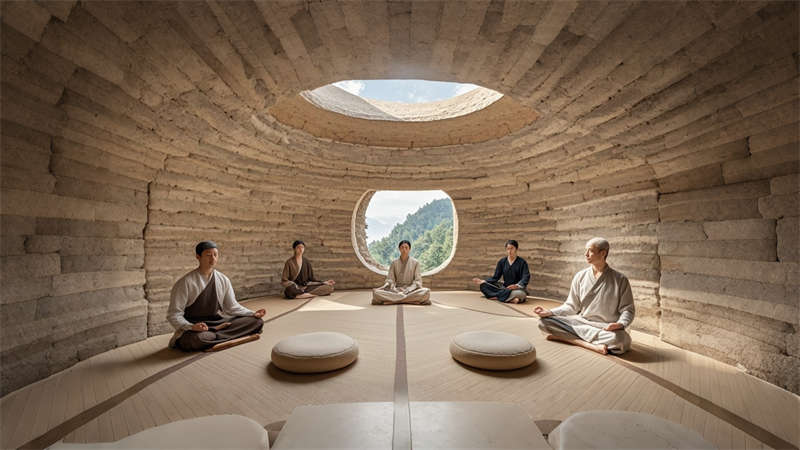 設計亮點包括:1)夯土墻面內(nèi)置光纖導光系統(tǒng),夜間呈現(xiàn)星圖光影;