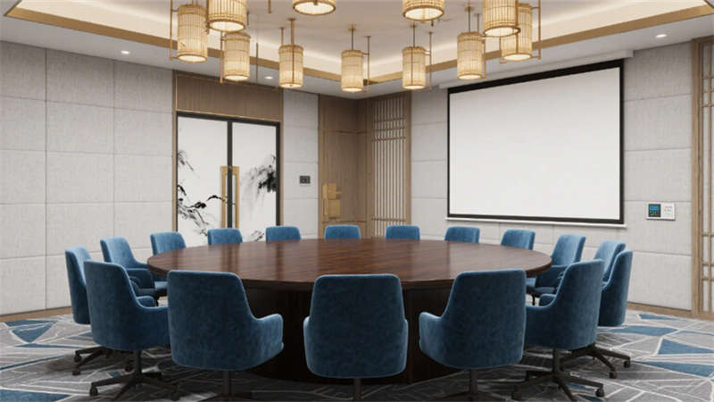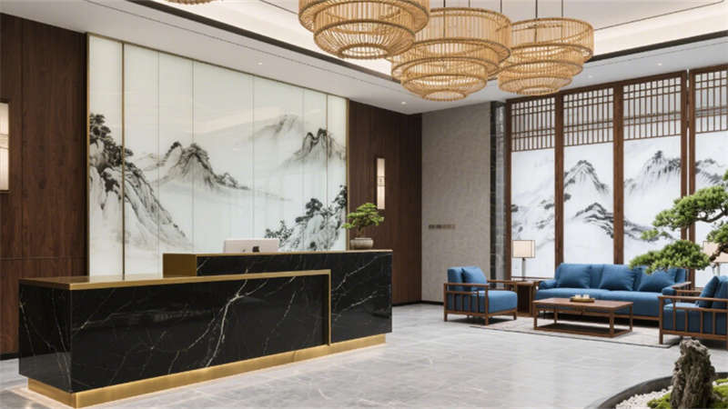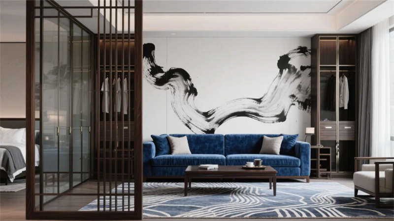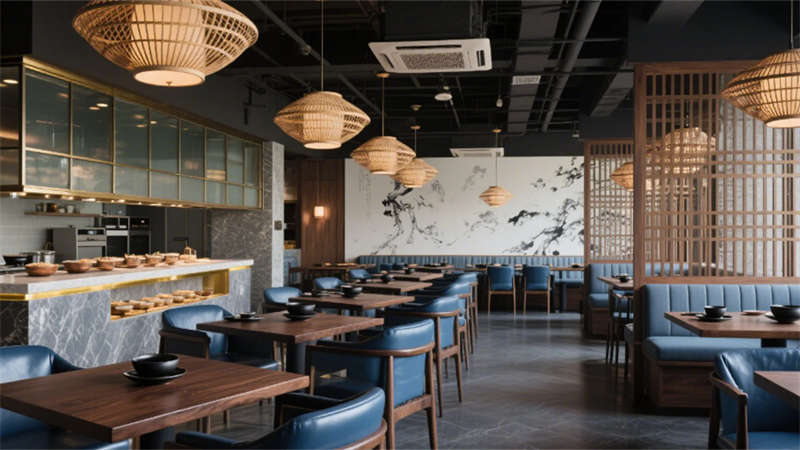 步入大堂,深胡桃木墻面與淺灰石材地面構(gòu)成經(jīng)典東方底色,水墨藝術(shù)玻璃屏風(fēng)似山巒疊嶂,懸浮竹編吊燈以編織肌理軟化空間。靛藍色沙發(fā)與黃銅細(xì)節(jié)的點綴,既延續(xù)外立面色彩邏輯,又激活視覺層次。餐飲空間延續(xù)木格柵語言,竹編燈罩與黑陶器皿在開放式廚房的金屬框架中碰撞,演繹“新舊共生”的餐飲儀式。