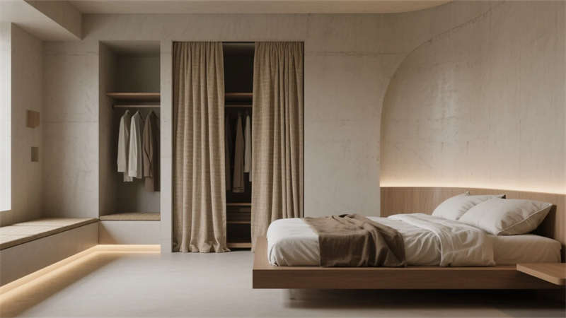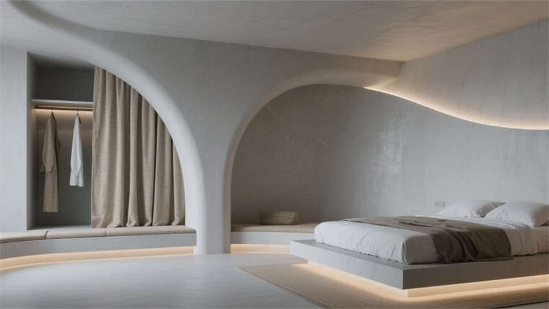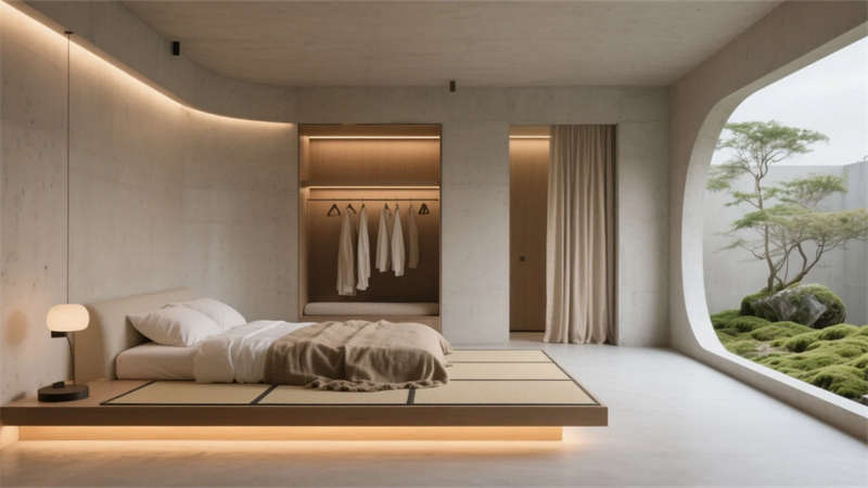 衛(wèi)浴空間化身立體水景容器,鏡面天花反射青石浴缸與垂吊綠植,形成虛實(shí)交織的自然劇場。所有構(gòu)件皆服務(wù)于居者與環(huán)境的對話,混凝土墻體在晨昏光線中呈現(xiàn)不同肌理,定制家具的圓弧收邊柔化現(xiàn)代主義的冷冽。