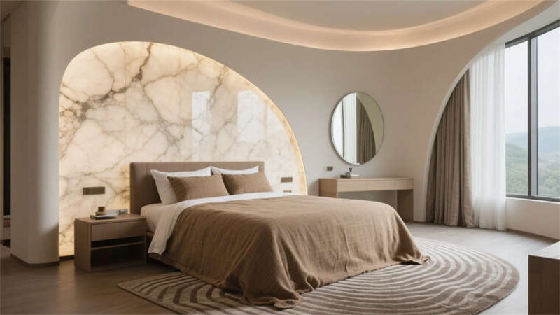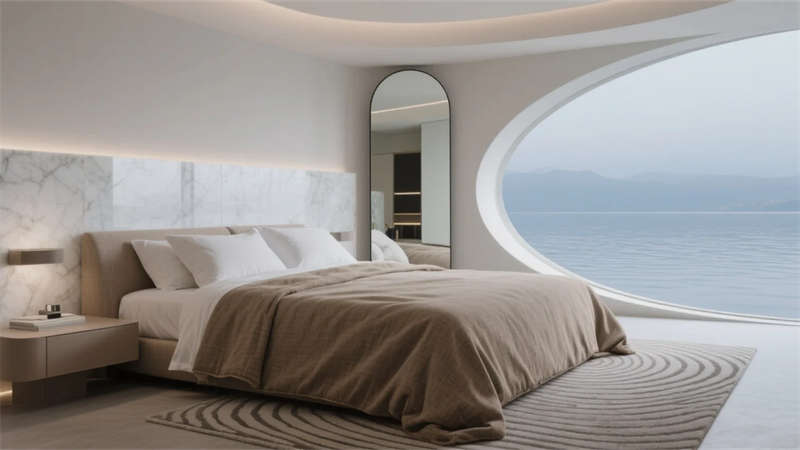每一處細(xì)節(jié)皆成藝術(shù)現(xiàn)場(chǎng)——走廊夯土墻鐫刻時(shí)光肌理,發(fā)光地磚指引探索路徑;臥室弧形鏡面折射虛實(shí),讓人沉入湖居夢(mèng)境。這里不僅是棲居之所,更是一場(chǎng)喚醒感官的在地美學(xué)巡禮,讓合肥的湖韻林語(yǔ),成為流淌于日常的奢享印記。