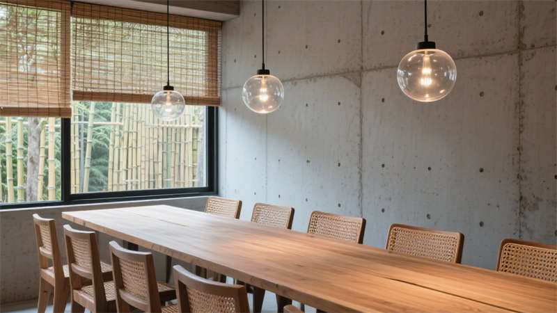 本設(shè)計(jì)以自然與現(xiàn)代的融合為核心,延續(xù)了原木、玻璃與清水混凝土的材質(zhì)語(yǔ)言,將合肥地域的溫潤(rùn)氣質(zhì)與侘寂美學(xué)相呼應(yīng),打造出兼具舒適感與藝術(shù)感的居住場(chǎng)景。公共區(qū)域中,淺橡木色的柜體與天花線條連貫延伸,搭配通透的玻璃隔斷,讓光線自由穿梭,模糊室內(nèi)外的邊界;清水混凝土墻面保留了原始肌理,與苔蘚綠的軟裝陳設(shè)形成柔和對(duì)比,傳遞出質(zhì)樸而寧?kù)o的氛圍。?