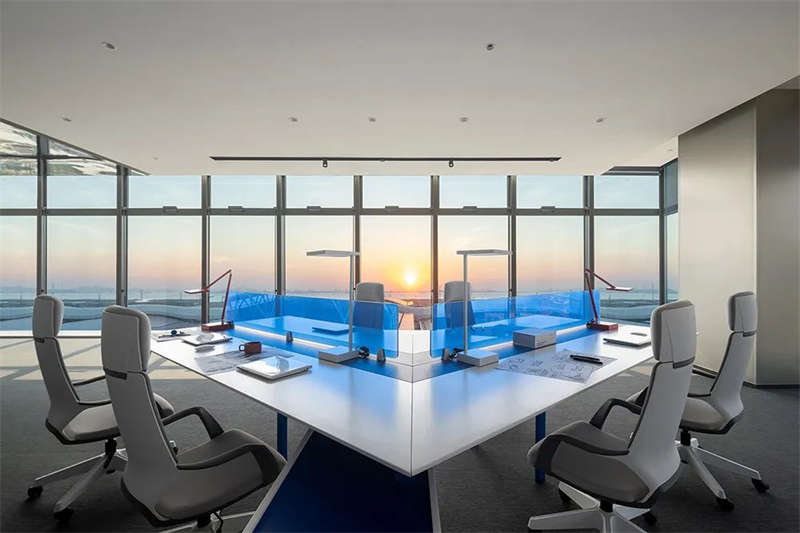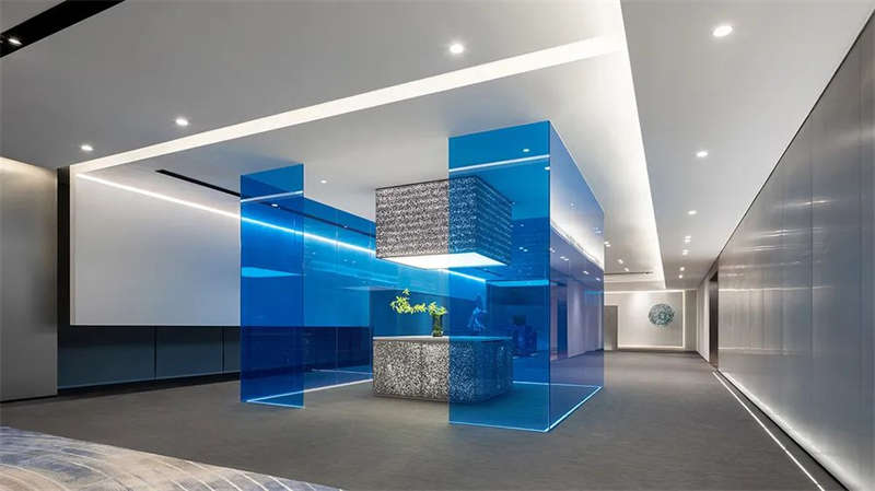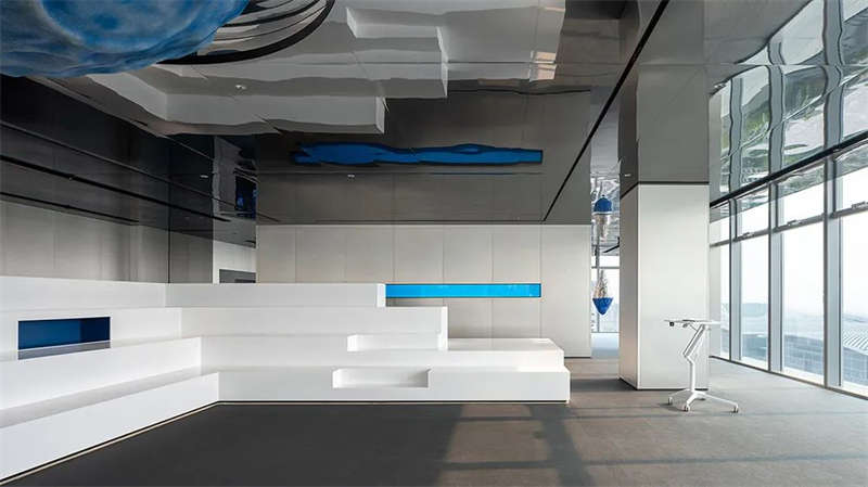 設(shè)計師在灰調(diào)的空間中,注入純凈的克萊因藍,高飽和度的單純色彩具有神奇的魔力,讓人們在強烈的視覺沖擊下迷失感官,與室外的海天融通一體,達致沒有感官桎梏的心靈自由;灰色則讓空間保有充裕的從容,以及留白的呼吸感。以此實踐在物質(zhì)之上,具有純粹精神的空間情景。