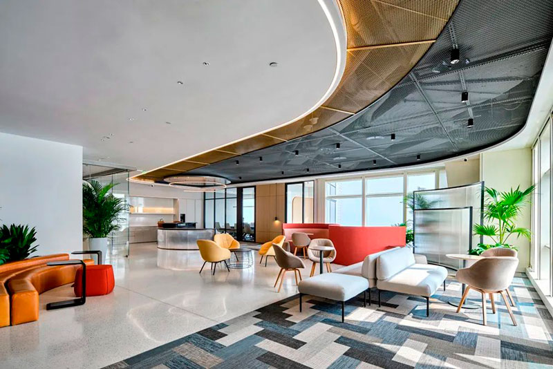 不同于投資公司的傳統(tǒng)形象,設(shè)計師以一個圓島吧臺和開敞的自由交流區(qū)作為前廳接待場所。大量的自然光涌入室內(nèi),明凈開闊。天花地面是圓轉(zhuǎn)流動的曲線造型,采用水磨石地面、金屬網(wǎng)天花、Bolon塑膠地毯等各種新環(huán)保材料,輔以色彩鮮麗的多功能家具組合、大型LED屏和隨處點(diǎn)綴的綠植,呈現(xiàn)出年輕、現(xiàn)代、科技而又充滿能量的生命氣息。