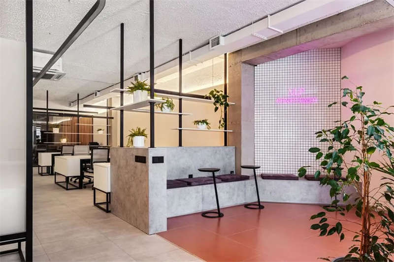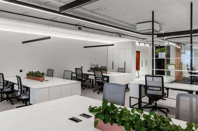 淺灰色的頂面與地面,配以白色墻體和主體辦公家具,再輔以縝密的燈光照明,讓室內(nèi)呈現(xiàn)明亮純凈的光彩質(zhì)感;黑色線性元素的加入豐富了空間構(gòu)成和視覺趣味性;唯一的暖棕色彩的點綴讓空間更靈動更富有層次感,也為純凈極簡的空間帶去一抹溫暖氣息。