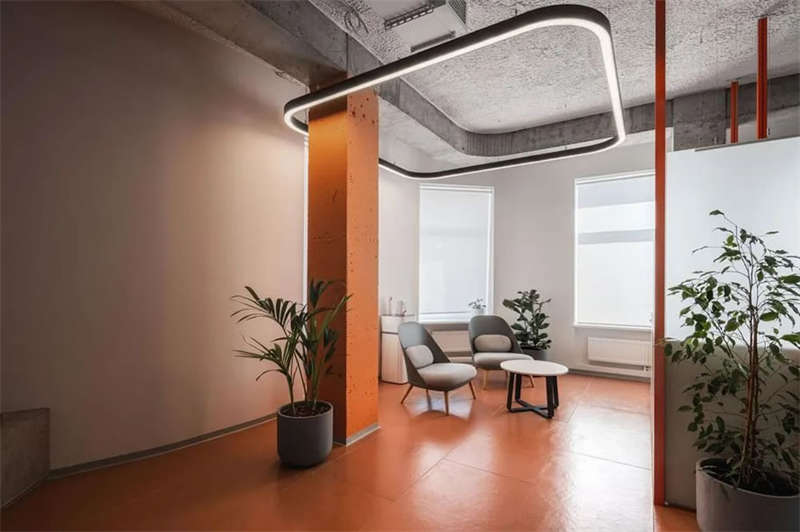 一種是沿辦公室周邊設(shè)置了一圈燈帶,燈光從白色天花板上反射出來,散發(fā)出令人賞心悅目的溫暖漫射光。還有一種線性照明形式呼應(yīng)流線型的建筑輪廓,將整個辦公室從入口區(qū)域連接到行政工作區(qū)。另一個這樣的設(shè)計元素出現(xiàn)在廚房區(qū),當陰天自然光不足時可以照亮這里的空間。此外,每組工位都有一個獨立光源,如有必要,每個員工都可以自行打開或關(guān)閉。