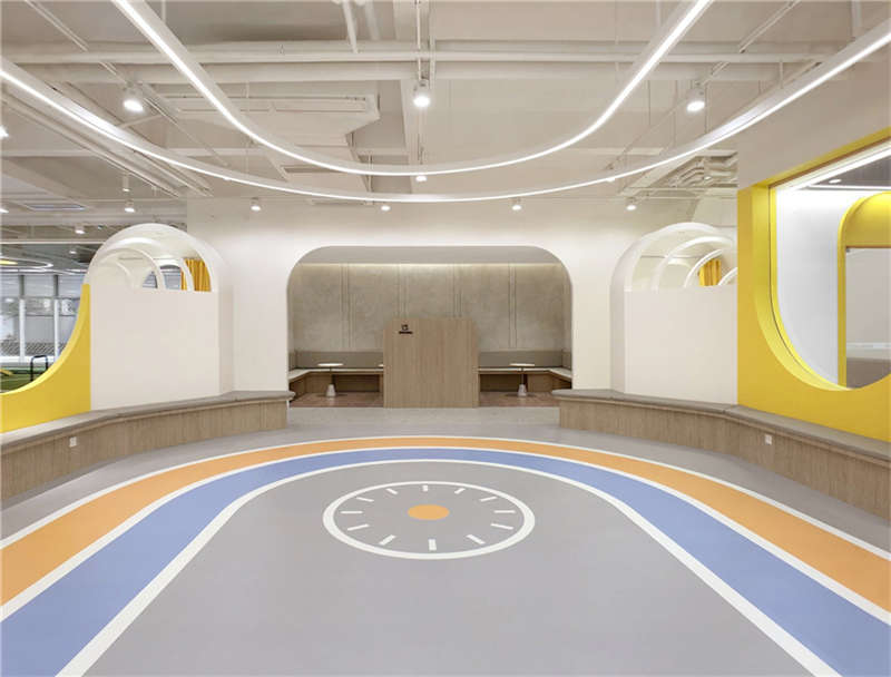 陽光洗禮這片綠茵,賦予茁壯的祝福??臻g抹去一堵墻體,消弭了教室的結(jié)構(gòu),其功能得到了重塑,給組合課堂提供支持。地面的跑道被星球的神奇能量映射在空中,下一秒的跳躍,也許能乘駕著時間,奔跑向星辰和大海。每一個教室的教具都被用心安放,留給孩子們足夠的空間揮灑自由。柱間尺度的限制下我們轉(zhuǎn)換了家長的看課方式,親子間共同的成長是我們對場所的思考。