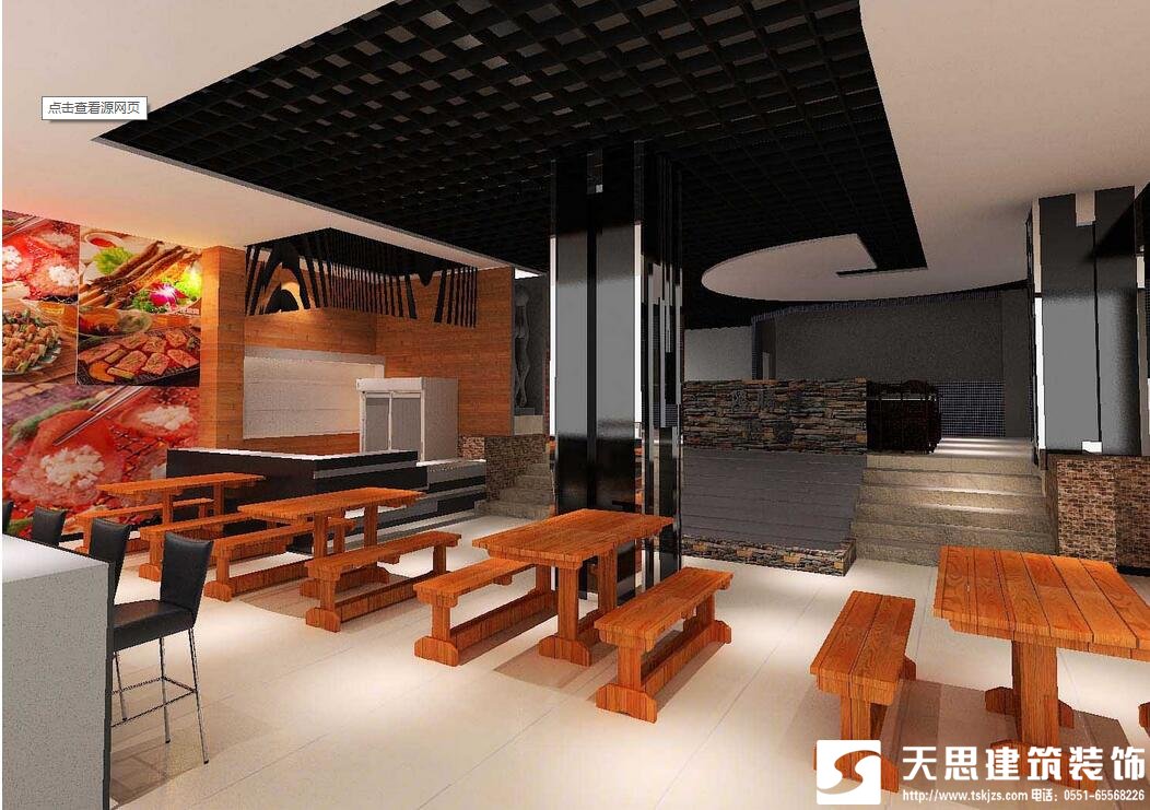 7、燒烤店裝修設(shè)計(jì)墻面的處理:以前沒(méi)有墻紙之類裝潢的時(shí)候,大多燒烤店都是白色或者圍一些墻裙,白色容易弄臟而且不好清洗,時(shí)間長(zhǎng)了墻面的衛(wèi)生會(huì)很大的影響客人就餐的心 情,因?yàn)闊镜暧托员容^多,客人吃飯手腳不老實(shí)來(lái)回蹭。墻面可以貼墻紙,但是顏色選擇上不但看起來(lái)干凈、明亮而且不能易臟,這個(gè)裝修感覺(jué),磚木色的地板任 何時(shí)候看起來(lái)都是顏色亮麗。