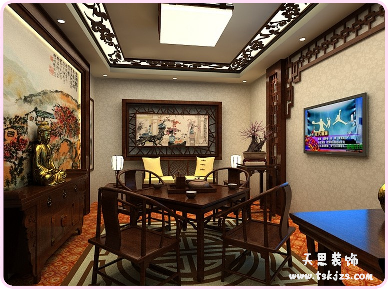 設(shè)計(jì)思路:以仿清代室內(nèi)布置為主.用清式家具和窗花、字畫、木欄干等管造古色古香的氛圍。廚衛(wèi)和孩子房則以現(xiàn)代裝飾手法為主。古為今用、古今結(jié)合,創(chuàng)造居空新風(fēng)貌。