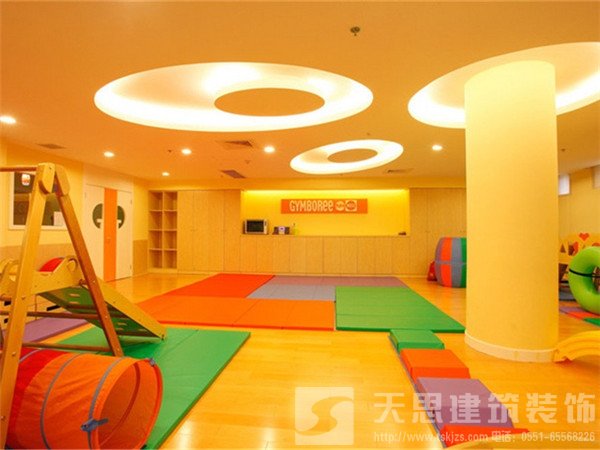 考慮到目前部分幼兒園的室內(nèi)空間不符合標(biāo)準(zhǔn),如果是過高的空間,可考慮頂面裝修或懸吊一些裝飾物,以降低其空間,改變視覺上的空曠感。頂面的表層不能太光滑,這樣有利于增強(qiáng)吸聲效果,避免產(chǎn)生眩光。如果是頂層,還要考慮隔熱情況。頂面裝修要使用隔熱、阻燃和防火性能好的裝修材料,如石膏板、鐵龍骨等。電線要放入阻燃管內(nèi),避免因電路故障而引發(fā)火災(zāi)。