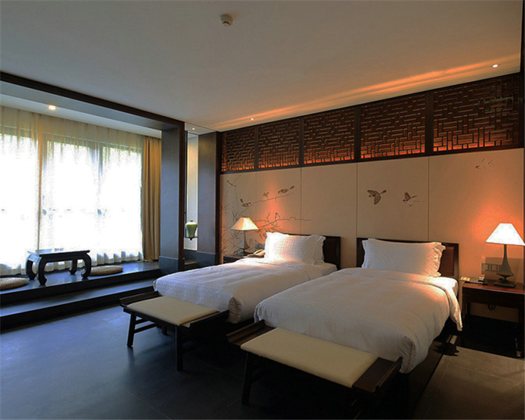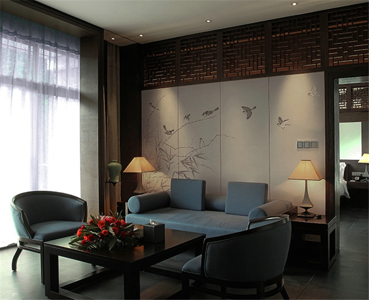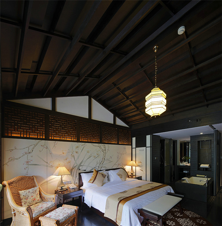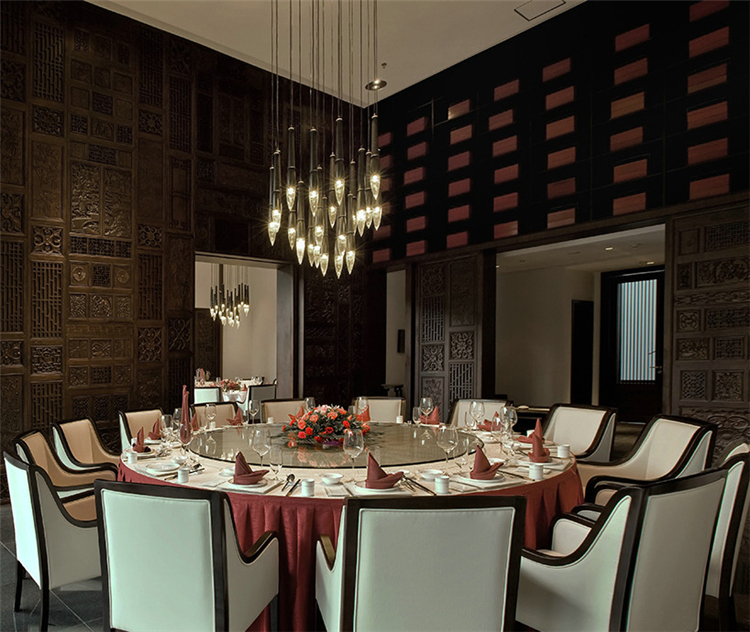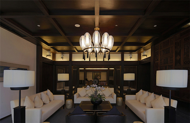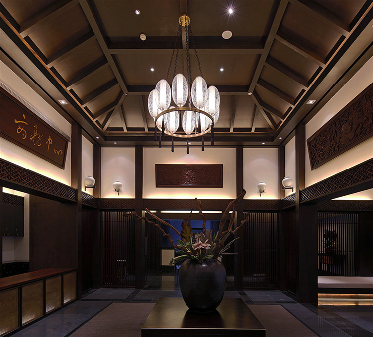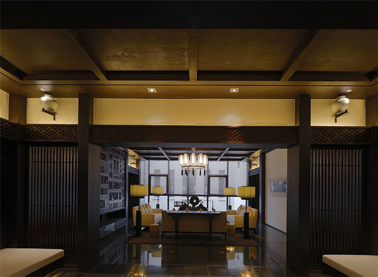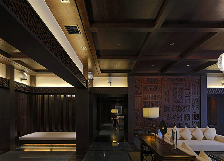 走入大堂,室內(nèi)空間寬闊,天花鱗次櫛比通向樓梯方向,墻面灰色石材雕刻,將桃花源記中的詩(shī)句映入客人眼簾,禪境古意撲面而來(lái)。鏤空屏風(fēng)隔墻的設(shè)計(jì),讓空間隔而不斷,與具有傳統(tǒng)韻味的家具和配飾相互交融,打斷俗世的紛擾。柱子和天花上的裝飾燈具,利用金屬和木材兩種截然不同的材料和質(zhì)地,創(chuàng)造空間內(nèi)在張力,透過(guò)銳利的金屬、細(xì)膩的木質(zhì)線條強(qiáng)調(diào)空間結(jié)構(gòu),精致筆挺的吊燈,令空間由內(nèi)向外展現(xiàn)獨(dú)特魅力。