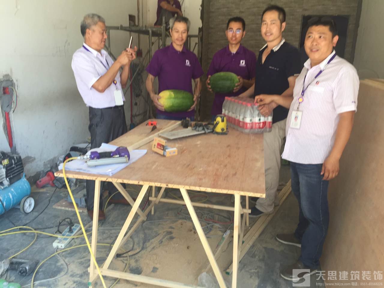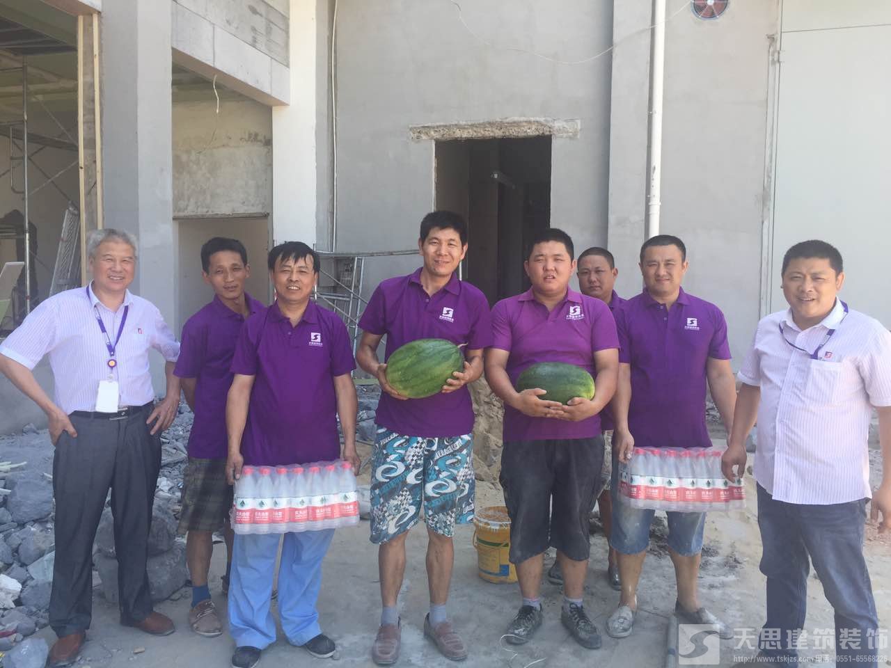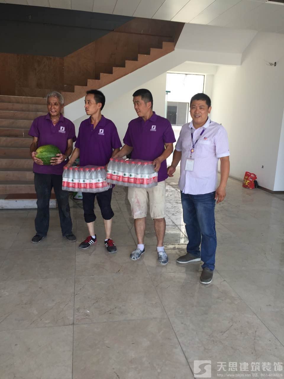 天思建筑裝飾公司為工作在第一線的天思項目經(jīng)理及工人送一點(diǎn)點(diǎn)小小的慰問品,謝謝你們的付出,你們辛苦了。天思一行對大家為趕工期、保質(zhì)量所付出的辛苦表示衷心感謝,并囑咐工地負(fù)責(zé)人要愛護(hù)裝修工人的身體,在保質(zhì)量為首要前提下抓好安全施工。施工盡量利用早、晚時間,盡量避開高溫時段;若發(fā)現(xiàn)有身體不適,要及時注意休息,情況嚴(yán)重的要及時送醫(yī)。