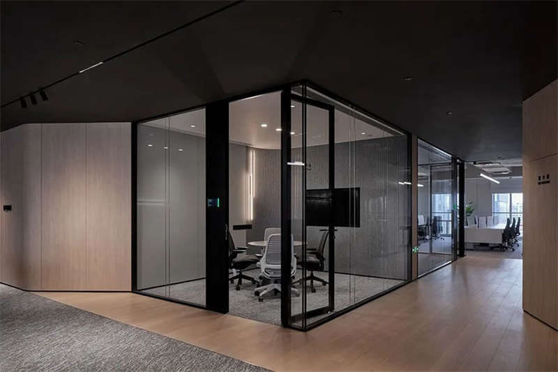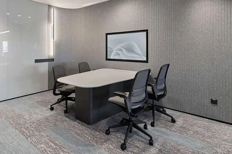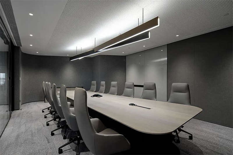 進(jìn)入會(huì)議空間,設(shè)計(jì)師刻意控制它的視覺(jué)張力,前區(qū)的體驗(yàn)得以延續(xù),灰黑色調(diào)覆蓋目力所及并引入更多的柔性材料,專業(yè)、專注是會(huì)議空間的功能立本但也不乏我們對(duì)活力元素的照拂,每一個(gè)會(huì)議室我們都選擇了形式各樣的藍(lán)色地毯來(lái)裝點(diǎn)。