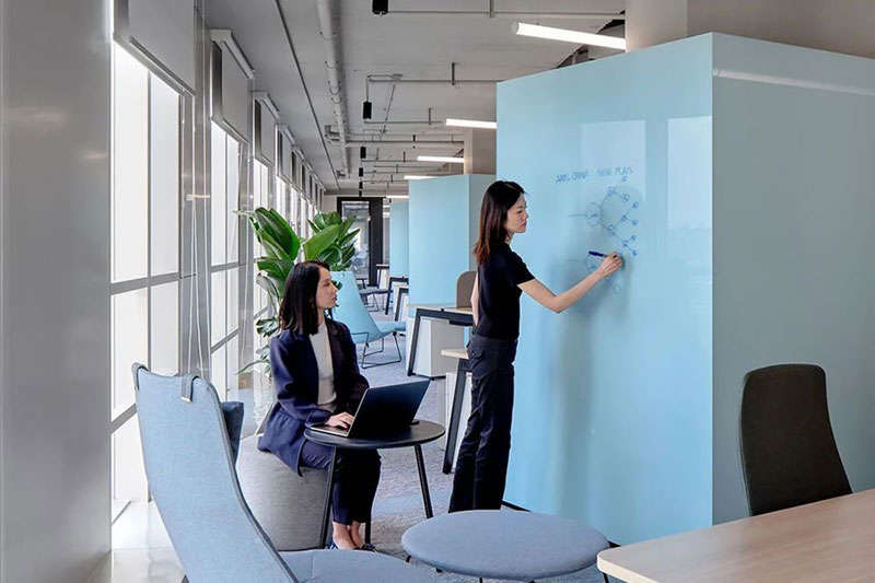 由于建筑不是專業(yè)寫(xiě)字樓,全開(kāi)放的租賃面積、過(guò)大的柱體、凌亂的工業(yè)管道天花也給設(shè)計(jì)提出了難題。為了平衡好行政辦公和會(huì)客及不同部門(mén)之間的功能分區(qū),設(shè)計(jì)師把打印、咖啡、小洽談休憩空間作為功能島置入整層的正中,合理分隔東西兩個(gè)工區(qū)并方便大家便捷使用。沿窗的柱體通過(guò)裝飾面的包裹和扭轉(zhuǎn)形成空間亮點(diǎn),輔以休閑家具,簡(jiǎn)短的洽談分享、小的會(huì)議討論在此得以解決,員工在介于室內(nèi)空間和自然窗光中獲得了獨(dú)特的體驗(yàn)和助益。