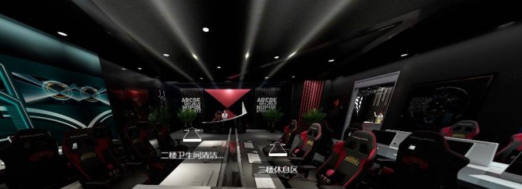 在二樓設(shè)備相對(duì)密集的競技區(qū),減少了主題相關(guān)的飾物和設(shè)計(jì),純粹用燈光來完成整個(gè)空間設(shè)計(jì)感的延伸,恰如其分地處理了密集空間地緊縮感。